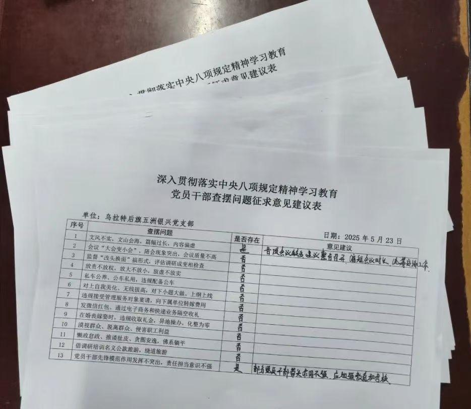 會上,大家對標習(xí)近平總書記關(guān)于加強黨的作風建設(shè)的重要論述和重要指示批示精神,對照《中央八項規(guī)定及其實施細則精神》,結(jié)合各自工作實際,堅持實事求是和問題導(dǎo)向原則,從思想引領(lǐng)、遵規(guī)守紀、作風建設(shè)、以學(xué)促干以及工作成效等方面做了全面查擺和自查自糾。同時緊扣中央八項規(guī)定內(nèi)容,從文風會風、推諉扯皮、擔當作為、公款旅游、隔空送禮等方面編制、印發(fā)了《黨員干部查擺問題征求意見表》,認真聽取黨員群眾的意見和建議。
